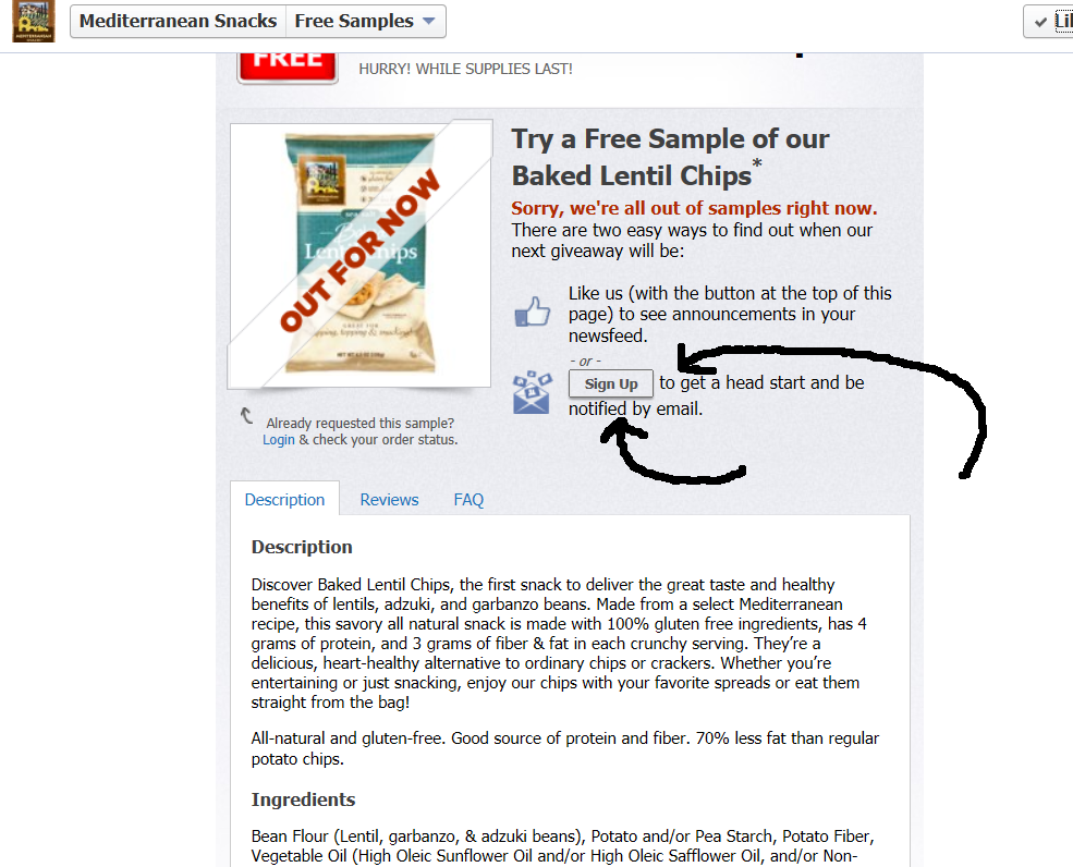 Secondly, you’ll have to ‘like’ their Facebook page and sign up for the notifications of free products (see photo below)