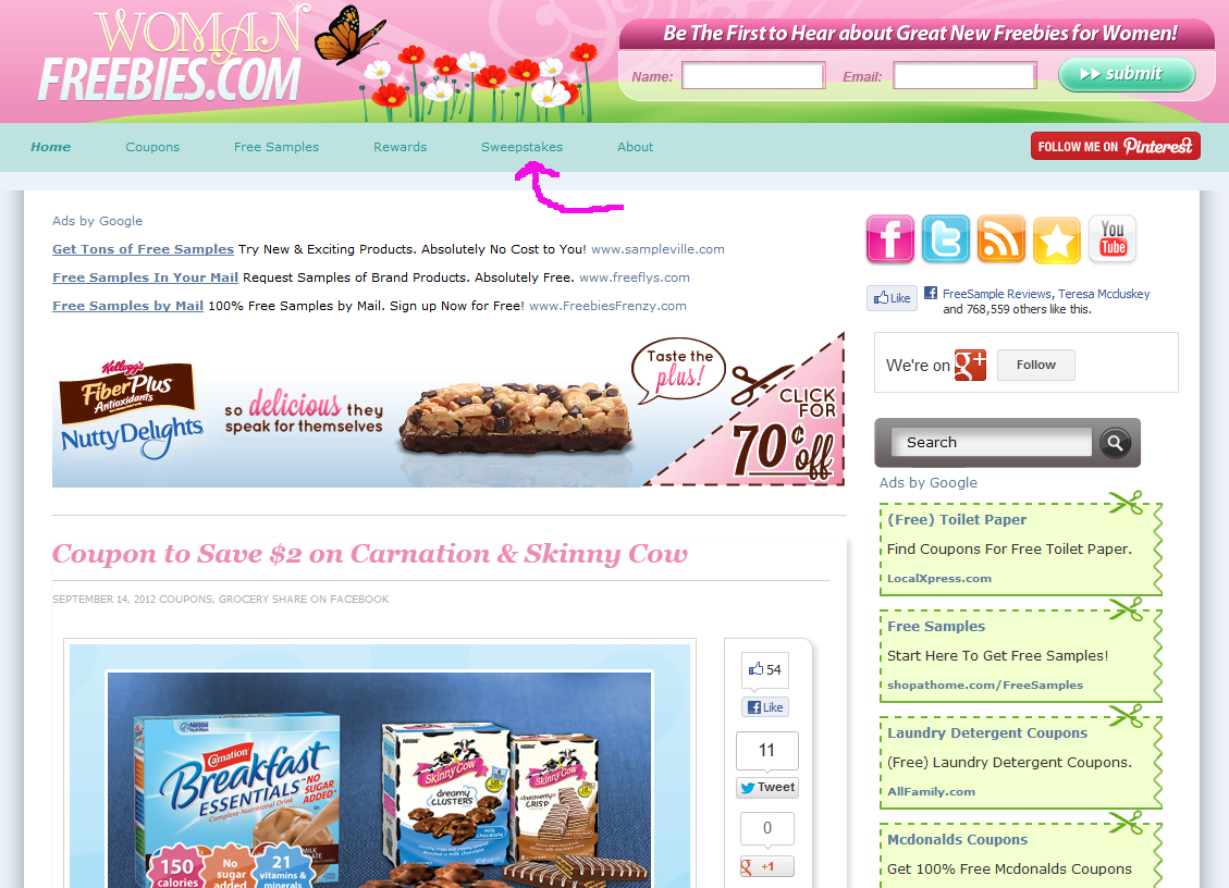 After you sign up click the blog tab (very bottom of page) and then click on the sweepstakes tab (top of next page). You’ll see that there are a lot of contests you can enter here!