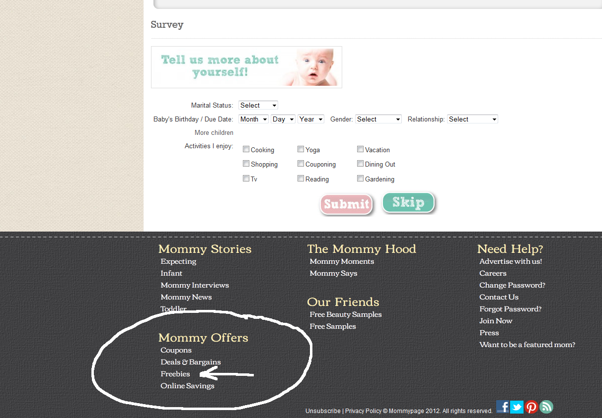 Join the free site, then scroll all the way down and click on FREEBIES under Mommy Offers (see photo below)