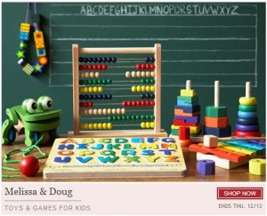 One Kings Lane has a Melissa & Doug Toy Sale and they are disappearing fast! They will still arrive by Christmas, too! Just look for the special badge!
