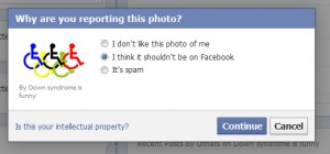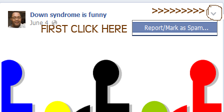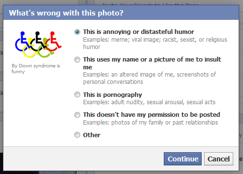 This is horrible. There is a page on Facebook that is there solely to make fun of people with Down Syndrome. Unbelievable. The page has already been reported many times, but so far, they are refusing to take it down. We need to make sure that it goes viral and that Facebook is deluged with people demanding that the page be taken down.