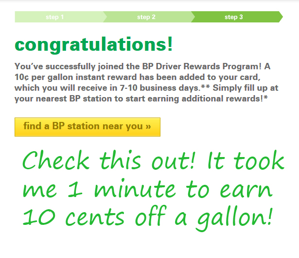 Even if you don’t usually get your gas there, go ahead and sign up for the rewards program and get that initial 10 cents a gallon off. And besides, you never know when you might be driving somewhere and BP is the only station around. This is super easy!