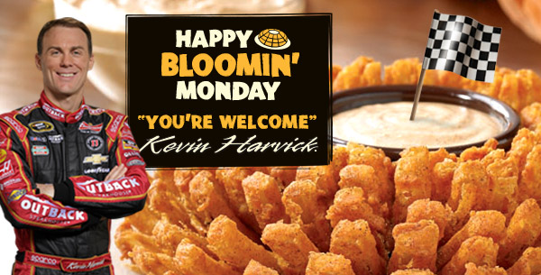 Come in to Outback and get a FREE Bloomin’ Onion* on Monday, February 23rd! It’s a Happy Bloomin’ Monday™ because Kevin “Happy” Harvick finished in the top 10 this weekend. Just say “Bloomin’ Monday” to your server. Sometimes, sweet, sweet success tastes like a free, free Bloomin Onion.