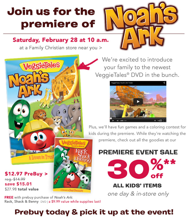 How fun! There’s a new kid in town in the VeggieTales Community! On Saturday Feb. 28, VeggieTales will be releasing their newest movie, “Noah” onto DVD! Our family saw the movie and it’s fantastic – just what you would expect from the VeggieTales franchise. You can read my review here. It will be available for purchase at all Family Christian locations on the 28th. And you can prebuy it and get a freebie!