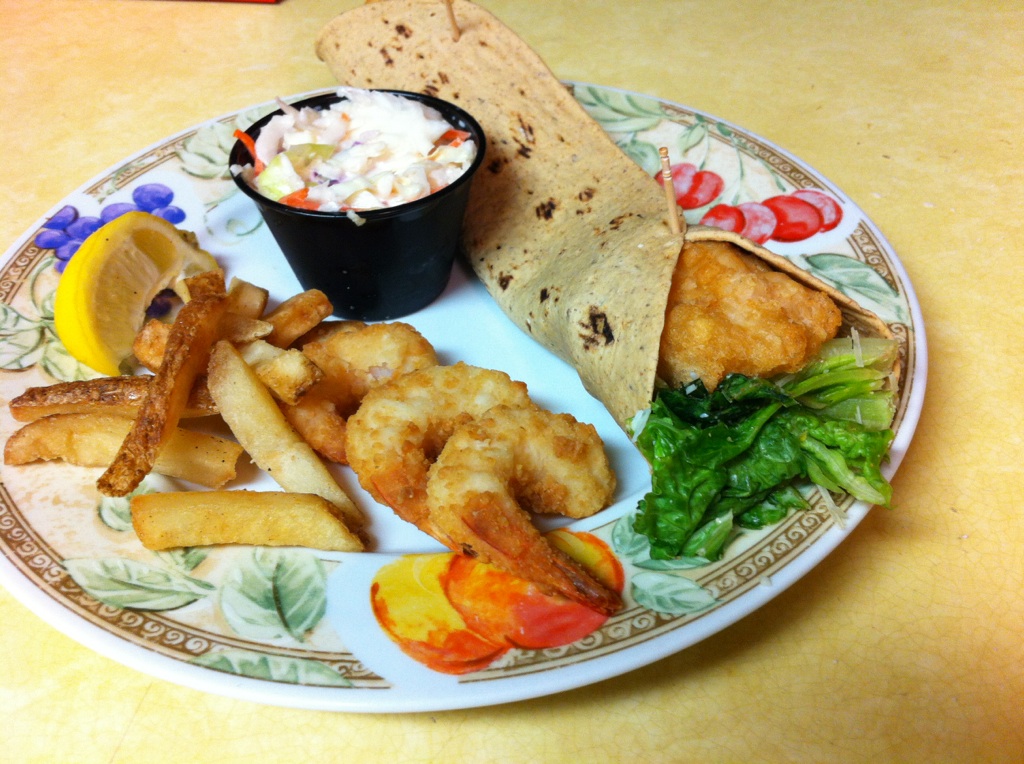 So anyway – I baked the fillets and then put them in wraps. Inside the wrap I added some Caesar salad and a little tartar sauce. Voila! Caesar Seafood Wraps. On the side, we had some oven baked fries, leftover shrimp and some coleslaw. Bam! Dinner was served and the family loved it.